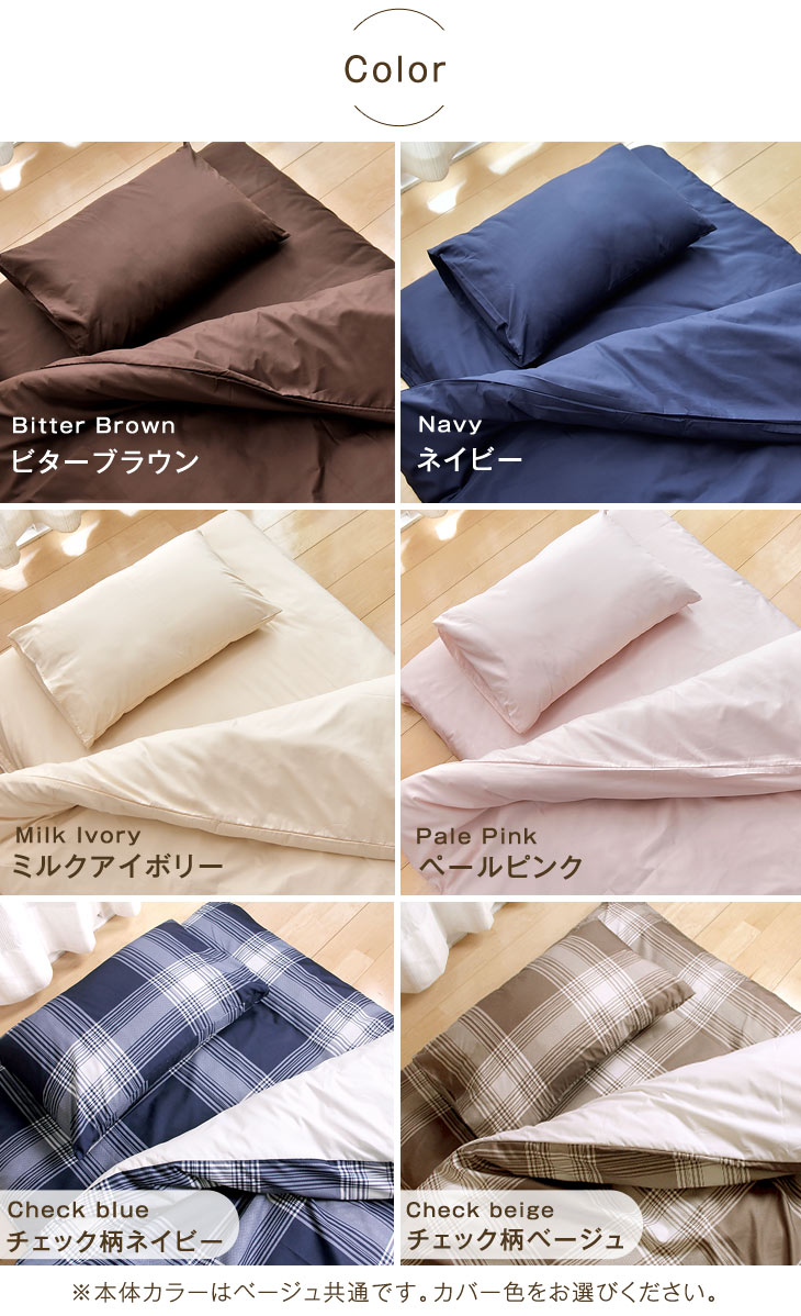 ▼メールでのお問い合わせはこちらf-sommelier@shop.rakuten.co.jpサイズ違いはこちらです セミダブル ダブル 商品スペック 掛布団 サイズ:幅150×長さ210cm 側生地:ポリエステル100%(ピーチスキン加工) 詰め物:ポリエステル綿100% 詰め物重量:1.6kg カバー用ループ数:6カ所 【スタッフあめちゃんのおすすめポイント!】 ・届いてすぐ使える寝具7点セット ・掛・敷・枕に抗菌防臭生地を採用 ・中綿たっぷり1.6kgのふっくらボリューム ・生地には全て肌触りなめらかピーチスキン加工 ・ほこりの出にくい中空ポリエステル綿を使用 ・洗える掛布団&枕 ・ISO9001認可工場で生産された安心の品質 ・収納ケース付き 敷布団 サイズ:幅100×長さ210cm 側生地:ポリエステル100%(ピーチスキン加工) 巻き綿:ポリエステル100% 固綿:ポリエステル100% 詰め物重量:約3.0kg枕サイズ:幅63×奥行43cm 側生地:ポリエステル100%(ピーチスキン加工) 詰め物:ポリエステル綿100% 詰め物重量:0.5kg カバー各種 素材:ポリエステル100%(ピーチスキン加工) 梱包サイズ 45x45x55cm カラー 布団本体:ベージュ カバー:ビターブラウン、ミルクアイボリー、ペールピンク、ネイビー、 チェックネイビー、チェックベージュ 収納ケース サイズ:幅100×奥行67×高さ35 素材:ポリエステル不織布・PVC 生産国 【中国製(日本で企画し中国で製造したものです)】 送料 【送料無料(北海道・沖縄県・離島は送料別途)】 ※北海道・沖縄県・離島の場合はお問い合わせください。