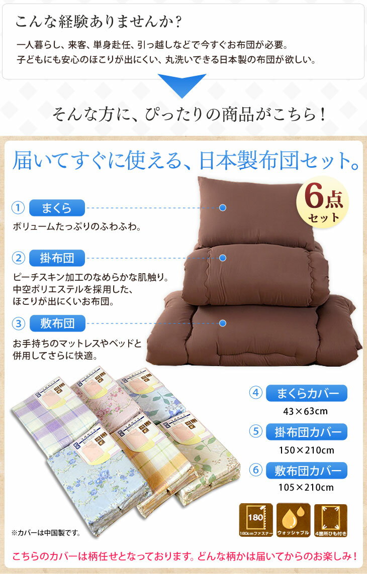 掛布団、敷布団、枕、カバー3点の6点とも洗濯可能。